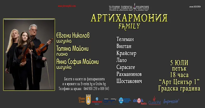 На 05 юли (петък), от 18 часа в,,Арт Център 1 “ в Плевен - градска градина, ще се организира камерен концерт на АРТИХАРМОНИЯ Family. Разнообразната програмата, която музикантите ще изпълнят в галерийното пространство, включва творби на Телеман, Виотан, Крайслер, Сарасате, Лало, Рахманинов и Шостакович в соло, дуо и трио обединения.
