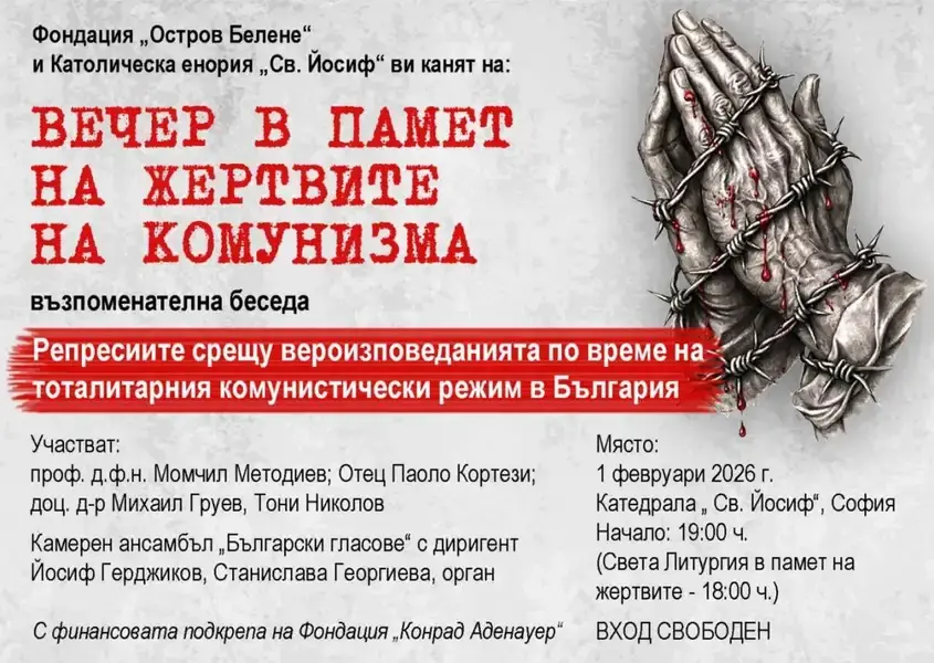 На 1 февруари от 19 ч. в католическата катедрала " Св. Йосиф " в София ще се организира " Вечер в памет на жертвите на комунизма ", отдадена по особено на „ Репресиите против вероизповеданията по време на тоталитарния комунистически режим в България “.