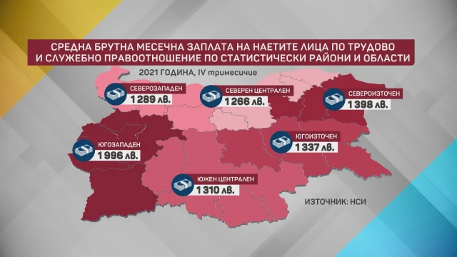 В Северозападния (1289) и Северно-централния регион (1266) междинната брутна месечна заплата е под 1300лв. Не е изненада, най-високоплатен е Югозападния регион, където се намира и столицата. Тук междинната брутна заплата за месец е 1996 лева