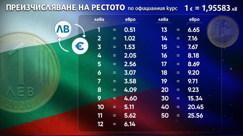 Вижте в таблицата по-долу по какъв начин ще наподобява рестото от най-често срещаните суми в левове, преизчислено в евро - с цел да сте готови за първите си покупки след въвеждането на единната валута. За точни калкулации на суми, цени и заплати можете да употребявате и формалния калкулатор на Българска народна банка, както и калкулатора в специфичния информативен уебсайт еврото.бг, където се разгласяват всички настоящи уточнения, образци и вести за въвеждането на еврото в България.