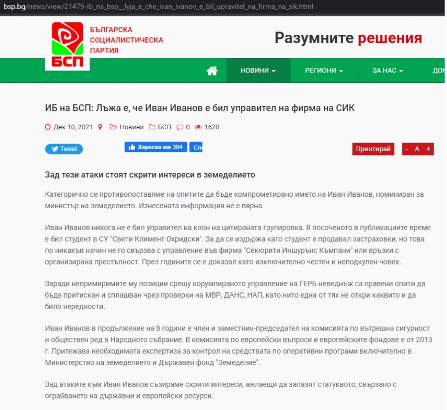 (Скрийншот от позицията на ИБ на Българска социалистическа партия за Иван Иванов)