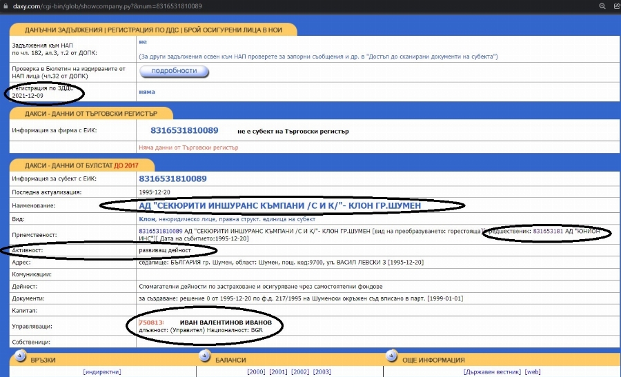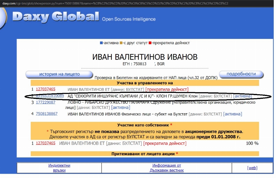 Видно от данните в него, Иван Валентинов Иванов – роден на 13.08.1975 година, е вписан като шеф на АД " Секюрити Иншуранс Къмпани /С И К/ ". Трите имена и рождената дата съответстват с на новия министър на земеделието. Фирмата е основана на 20.12.1995 година в град Шумен на улица " Васил Левски " №3. Партидата му е вписана по фирмено дело 217/1995 на Шуменски областен съд. Според " Дакси ", тя даже се води дейна, а в Търговския указател няма данни, само че в " Дакси " категорично е вписано, че компанията " не е индивид на Търговски указател ".
