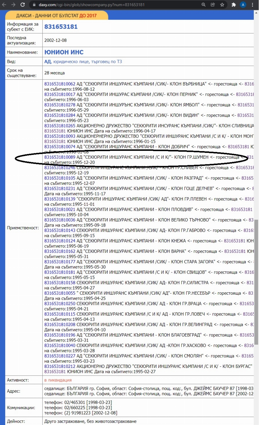 (Скрийншот от регистъра " Дакси " за компанията " Секюрити Иншуранс Къмпани /С И К/ към днешна дата)