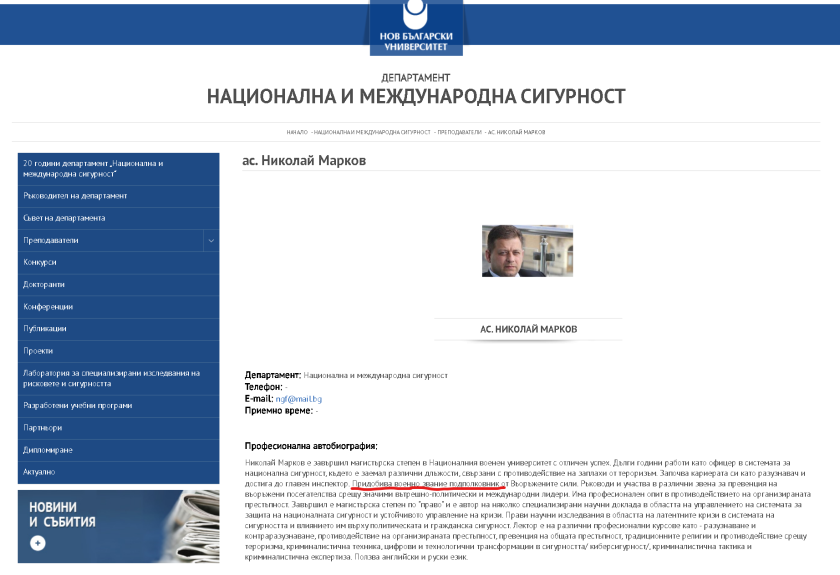 На уеб страницата на е посочено, че Николай Марков работи там като помощник в департамент " Национална и интернационална сигурност ". Приложена е къса биографична информация за него. От нея излиза наяве, че е придобил военно звание " подполковник " от Въоръжените сили.