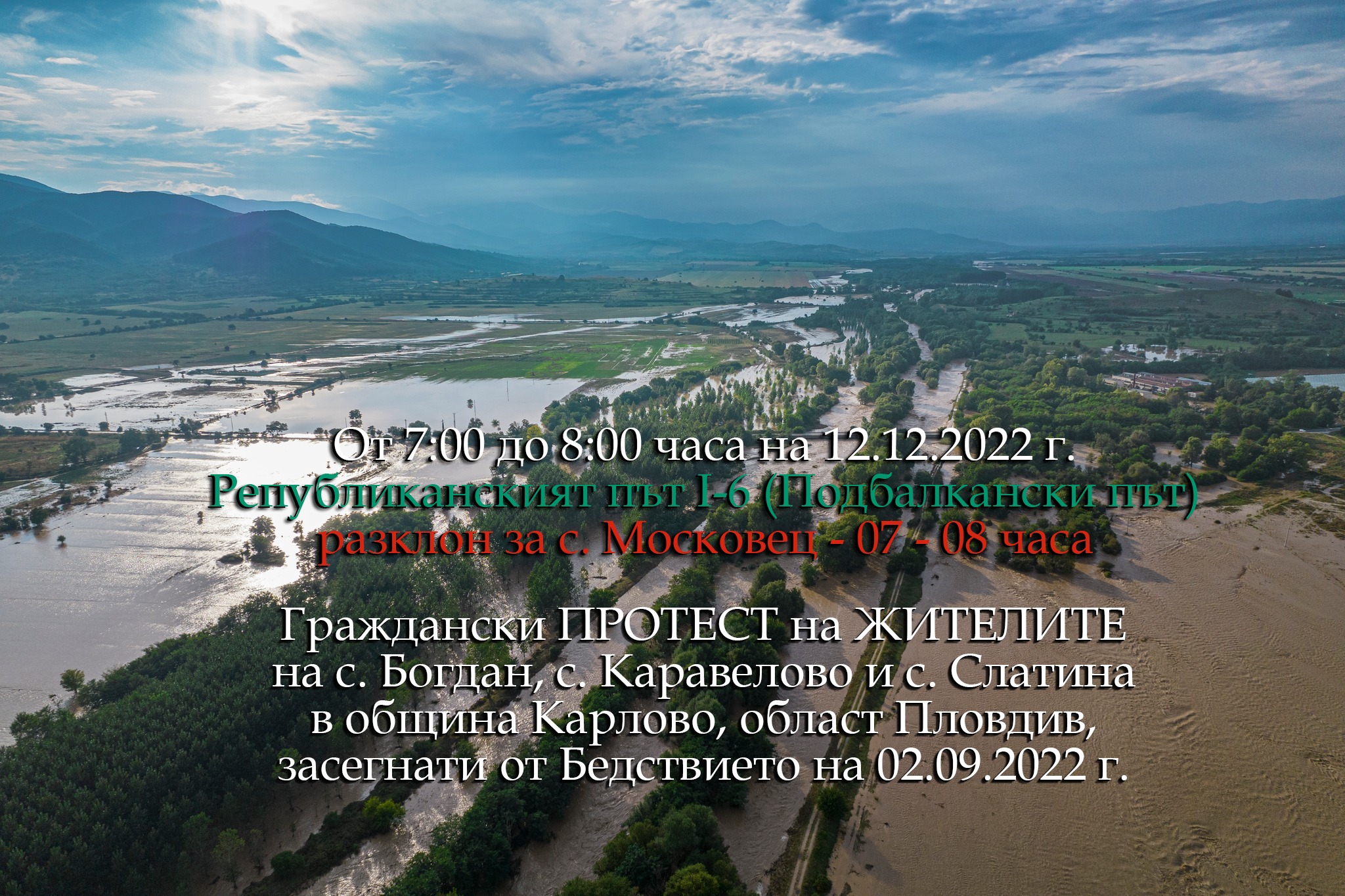 На 12-ти декември от 7:00 до 8:00 часа, жителите на наводнените карловски села излизат на цивилен митинг, който ще се организира на Републикански път I-6 (Подбалкански път), разклон за село Московец. Причината за недоволството на живеещите на с. Богдан, с. Каравелово, с. Слатина е, поради обещания за възобновяване на инфраструктурата и пътищата в селата, които обещания до днешна дата не са изпълнени от институциите.