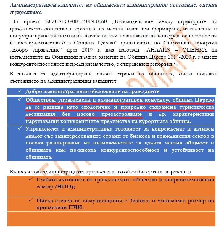 В плана особено се акцентира, че има „ публичен, управнически и административен консенсус община Царево да се развива като екологично и естествено съхранена туристическа дестинация без всеобщо презастрояване… “ На хартия звучи прелестно, само че действителността е напълно друга. На 13 юли общинският съвет гласува срещу разширението на европейската екологична мрежа " Натура 2000 " и още 1056 декара българска природа. Преди по-малко от 2 месеца общинският съвет по предложение на Лапчев бе на път да разцепи единствения общински терен, предвиден за спорт в с. Синеморец, на 14 обособени по-малки имота. Предложението на кмета предвиждаше новите парцели да бъдат отредени за застрояване. Гражданското неодобрение, което прерасна в митинг пред общинския съвет, и намесата на медиите предотвратиха затриването на единствената площадка за спорт. Кметът се разгласи за жертва на политически офанзива, само че въпреки всичко си отдръпна скандалната докладна бележка, като изясни, че не го прави под напън, а тъй като в последния миг видял, че в документите има някаква техническа неточност. Отделен въпрос е за какъв екологичен туризъм се приказва в проекта, откакто на територията на цялата община има единствено 2 пречиствателни станции – в Царево и в Лозенец. Курортни обитаеми места, като Ахтопол, Синеморец, Варвара и Резово нямат пречиствателни уреди и на всички е ясно къде отиват отпадъчните води. В плана за развиването на общината през идните 7 години няма и дума за този грамаден проблем. Оправданието е, че липсва общ организационен проект. Липсата на Общ устройствен план обаче не е спънка за построяването на ледена пързалка в Царево, с планирана стойност от към 8 милиона лв.. Липсата на проект не е проблем и за строителство в Политическа партия „ Странджа “ и в парцели, попадащи в предпазени зони по НАТУРА 2000. Ето един напълно свеж образец - община Царево е изработила ПУП-ПП (парцеларен план) за създаване на външно ел. зареждане на вилна постройка, която е обект на прокурорска инспекция. Същата тази община е презаверила разрешителното за градеж на хотела-фантом в Синеморец. За този хотел липсва позитивно мнение от РИОСВ-Бургас, като скандалното е, че преди време пред екоинспекцията е показано капиталово предложение за създаване на 3 вилни здания и такова за хотел в никакъв случай не е обсъждано от тях. В момента има съвсем приключен хотел с РЗП-над 9000 кв.м.+ СПА център. За този хотел-фантом също тече инспекция от прокуратурата.