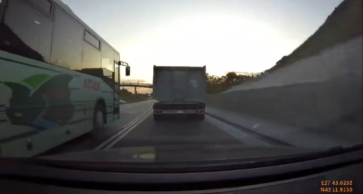 Видеото демонстрира по какъв начин рейсът внезапно се връща в лентата си секунди преди да се стигне до евентуален конфликт с насрещно движещ се товарен автомобил.