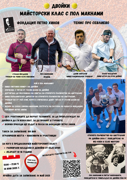 На 14 юни в Севлиево ще се организира майсторски клас за игра на двойки. Събитието се провежда от международната тенис легенда Пол Макнами и ще се организира от 13 до 17 ч.