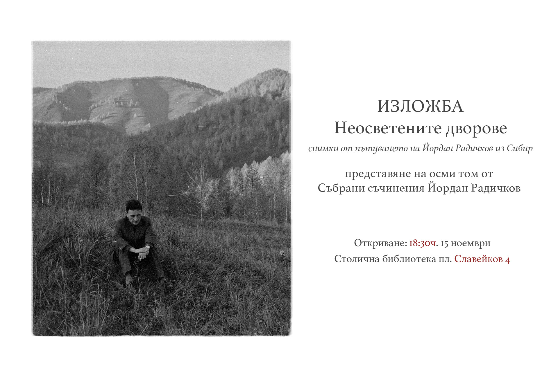 На 15-и ноември българските читатели ще могат да се срещнат с две от най-важните произведения в креативния път на Йордан Радичков. От 18:30 часа театралната зала на Столична библиотека ще бъде показан осми том от „ Йордан Радичков. Събрани съчинения “, който съдържа в себе си добре забравения му пътепис от Сибир от 1967 година „ Неосветените дворове “, както и любопитен роман за пътуването му до Швеция от 1980 година „ Малка северна сага “.