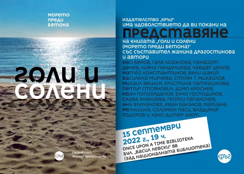 На 15 септември от 19 ч. в Once upon a time… Bibliotеka ще се състои формалното показване на сборника „ Голи и солени (морето преди бетона) “. Събитието е проведено от издателство „ Кръг “ и ще събере в тематична полемика огромна част от създателите, както и съставителката на изданието Жанина Драгостинова.