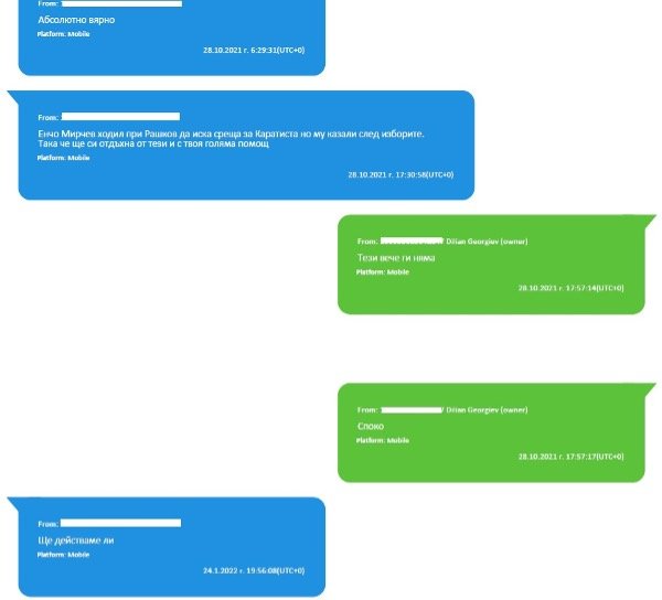 Писмена връзка сред обвинения Дилиян Георгиев и неустановено лице, в която се загатва името на министъра на вътрешните работи (към 28.10.2022 година Бойко Рашков) и лице, посочено като „ Каратиста “:
