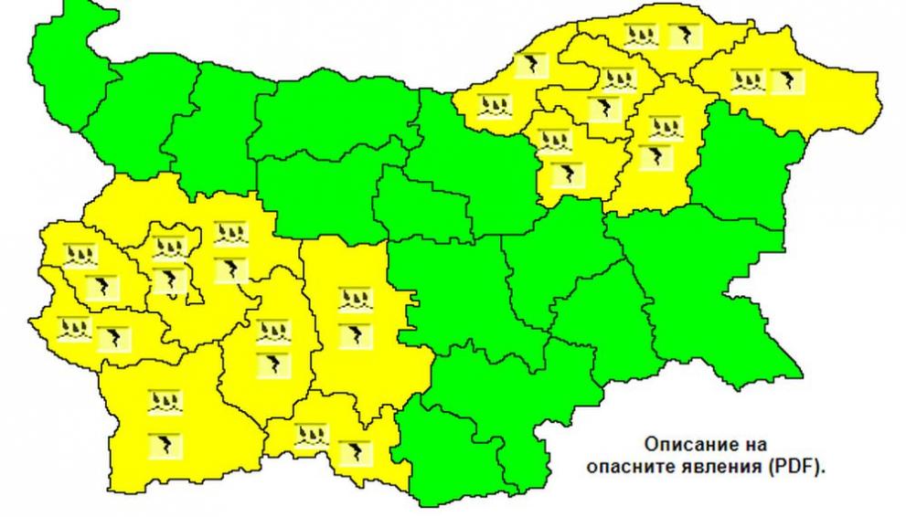 На 18 август е издадено предизвестие от първа степен за заплаха от интензивни превалявания с гръмотевици и градушки в 14 области от Североизточна и Югозападна България, оповестиха от Национален институт по метеорология и хидрология.