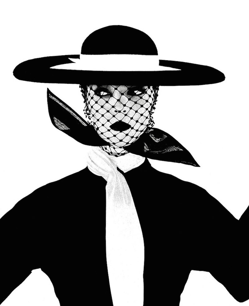 Model Jean Patchett in black and white hat with veil, scarf and top, Vogue, 1950