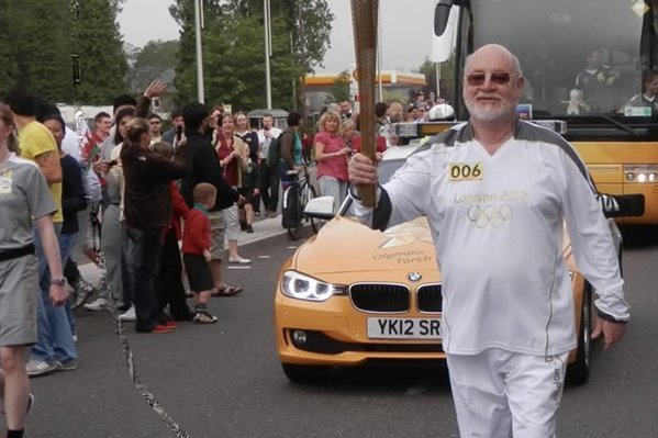 Джон Аткинсън носи олимпийския огън по време на игрите в Лондон 2012 година
