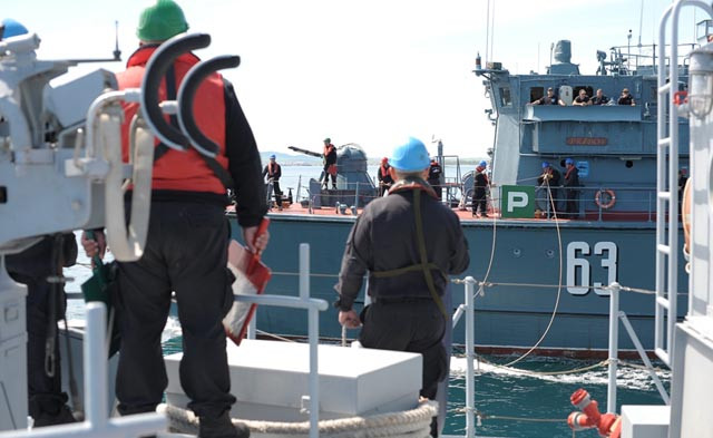 Базов миночистач „ Прибой “ извърши обозначаване на авансово обследван и обезопасен за корабоплаването канал. След това, взаимно с минен ловджия „ Цибър “ извърши обучение по приемане/предаване на леки товари на ход.