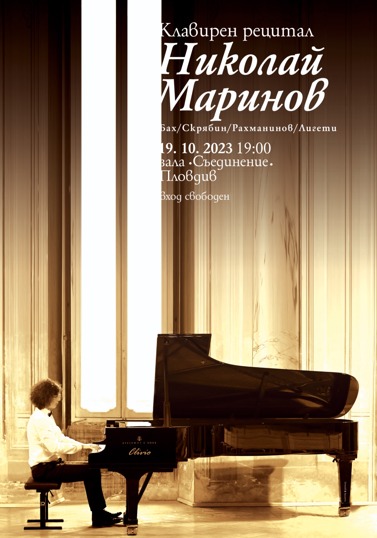На 19 октомври, от 19 часа, в зала „ Съединение “ Пловдив, с вход свободен, младият пловдивски виртуоз на пианото Николай Маринов, който преди по-малко от година стана абсолютнен победител на влиятелния Международен конкурс за пианисти в Италия „ Cita di Spoleto “, показва клавирен рецитал по творби на Бах, Скрябин, Рахманинов, Лигети.