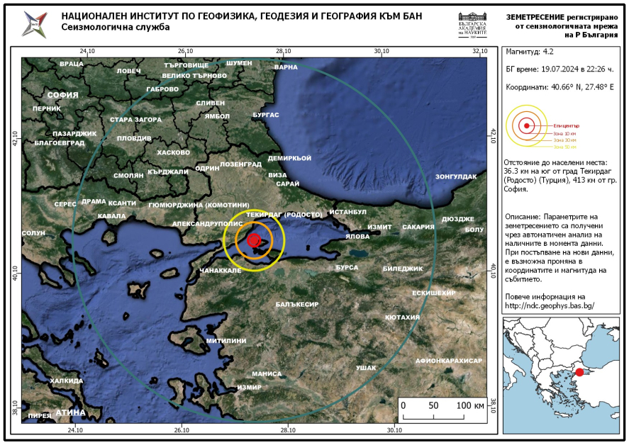 По данни на Националния Сеизмологичен Център към Национален Институт по Геофизика, Геодезия и География - Българска академия на науките, събитието от 22:26 часа българско време е с епицентър на 200 км от град Бургас и на 410 км от град София.