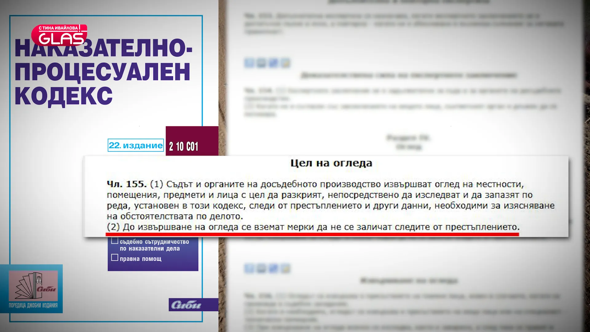 „ Съгласно член 155, алинея 2 от Наказателно-процесуален кодекс, „ до осъществяване на огледа се вземат ограничения да не се заличат следите от закононарушението “. Това обвързване е процесуално и има за цел да подсигурява достоверността на доказателствата. Неспазването му съставлява нарушаване на процесуалния ред и може да докара до опорочаване на доказателствените средства (напр. протокол от оглед), което предстои на преценка от съда при оценка на доказателствата. “