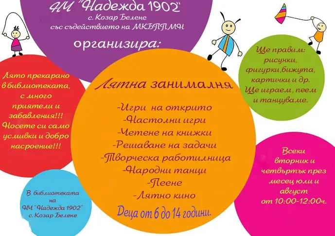 " Лятна занималня " е по едно и също време образователна и развлекателна стратегия, която има за цел да обогати знанията и културата на децата под формата на интерактивно образование, преплетено със занимателни игри, креативен ателиета, готварски работилници и провокации по време на лятната почивка.