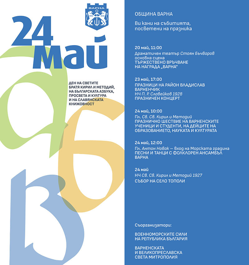 В навечерието на светлия празник ще бъдат тържествено връчени годишните награди „ Варна “ за достижения в региона на образованието, науката и културата, както и огромната премия „ Варна “. Тази година церемонията ще се състои на сцената на Драматичен спектакъл „ Стоян Бъчваров “, на 20 май (вторник) от 11:00 ч.