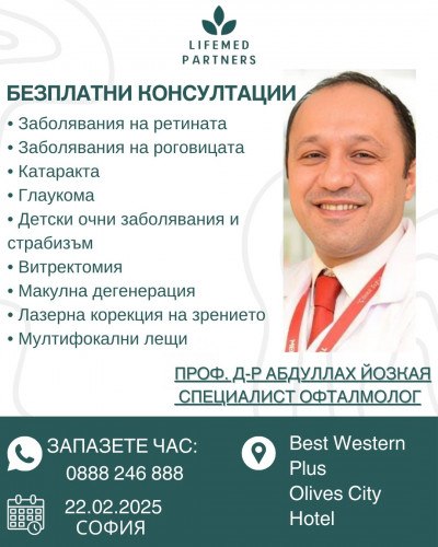 На 22 февруари 2025 година в София ще гостува водещ турски офталмолог – проф. доктор Абдуллах Йозкая, който ще организира безвъзмездни съвещания за пациенти с очни болести. Консултациите ще се осъществят по покана на Лайфмед Партнърс - здравен информативен център, който е с дълготраен опит в избора на най-хубавите експерти в турската медицина. За повече информация и записване: 0888 24 68 88