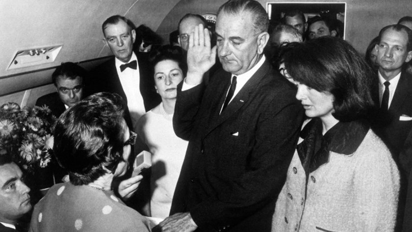 Вицепрезидентът Линдън Джонсън поставя клетва като президент на Съединени американски щати на борда на президентския аероплан на път от Далас до Вашингтон