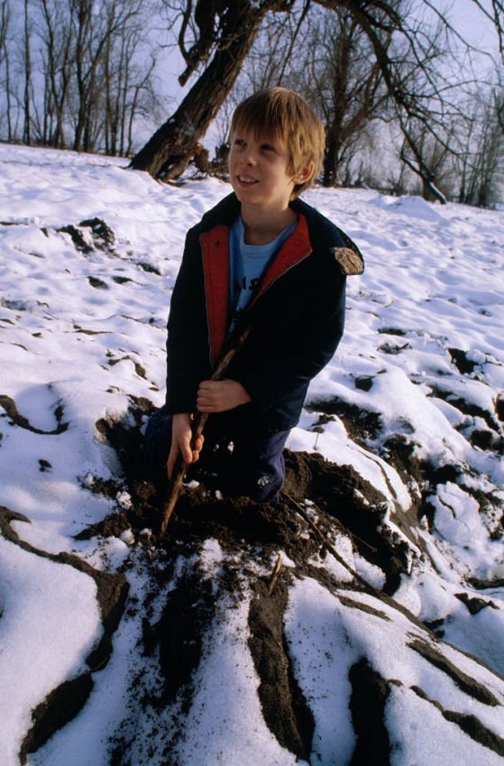 Браян Инграм, тогава на 8 година, демонстрира къде е разкрил плика с полуизгнили банкноти. Снимка: Getty Images
