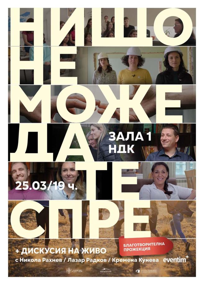 На 25 март 2025 година от 19:00 часа в зала 1 на НДК ще се организира благотворителна прожекция на документалния филм „ Нищо не може да те спре “. Филмът споделя за добротворчеството в България посредством вдъхновяващите истории на три от най-големите доброволчески организации, три по-малки начинания и една непринудено основана детска идея от град Златица, която стопля сърцата и ни предизвика да преосмислим целите си.