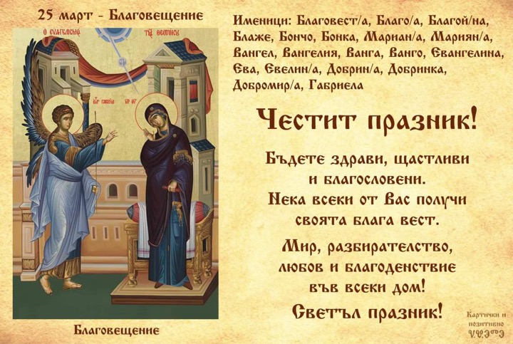 На 25 март Православната черква отбелязва празника Благовещение - денят, в който Архангел Гавриил донася богатствата новина на Дева Мария, че ще роди непорочно заченат наследник. В българската национална традиция празникът се назовават още „ Благовец “ или „ половин Великден “. Благовещение е един от непрекъснатите празници в църковния календар, защото всяка година се празнува на една и съща дата. Заедно с християнския, българите означават и фолклорния празник Благовец, който е част от Великденския празничен цикъл.
