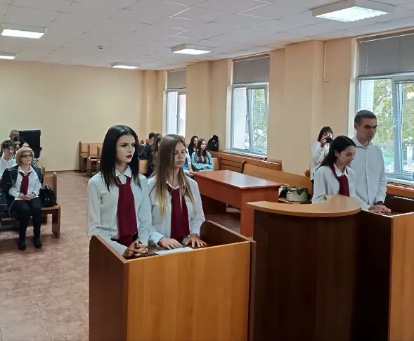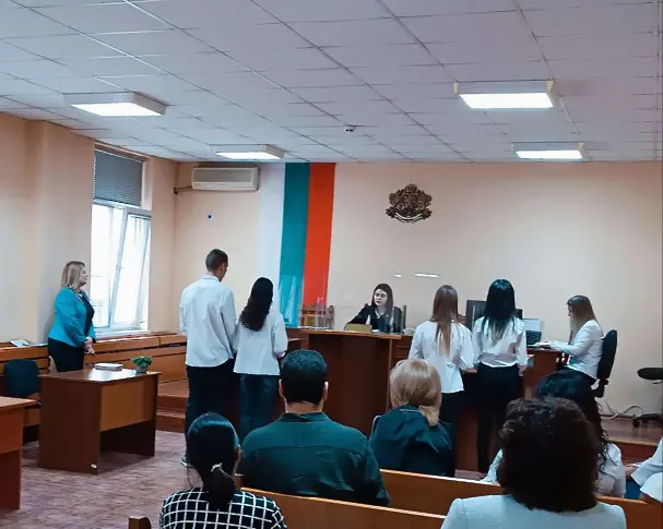 От 10:00 часа в Зала №3, ет. 2 на Съдебната палата, възпитаници от Професионална гимназия по ресторантьорство, търговия и обслужване – град Плевен, учащи се в паралелка със компетентност „ Съдебна администрация “, разиграха привиден правосъден развой по гражданско-правен проблем по отношение на даване на наставнически права.За следващ път учениците влязоха в функциите на арбитър, правосъден секретар, юрист и страни по делото.