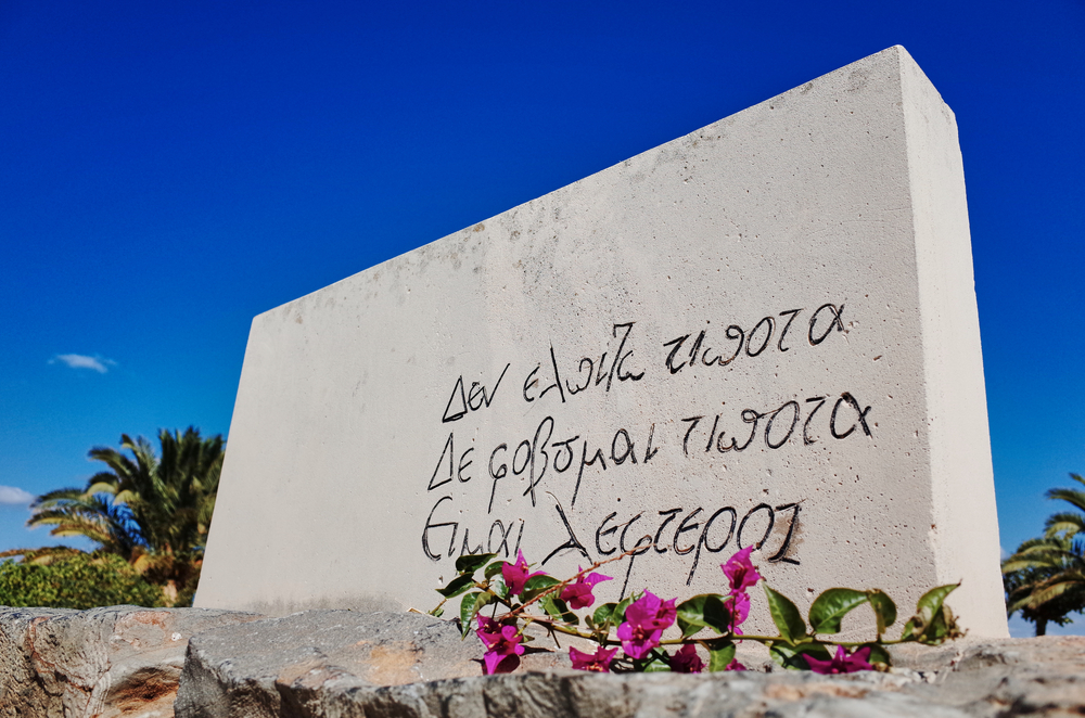 На 26 октомври 1957 година умира Никос Казандзакис. На гроба на писателя стои огромен дървен кръст със следната епитафия: „ Не се надявам на нищо, не се опасявам от нищо. Аз съм свободен. “