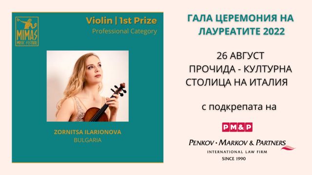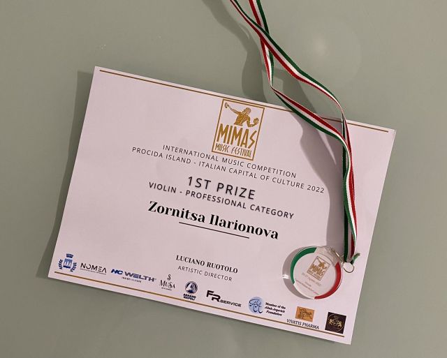 На 26-ти август тази година се състоя Гала на лауреатите и връчване на премиите на спечелилите от Международния конкурс за цигулка, пиано и оперно пеене “Мимас ” - Прочида, Италия.