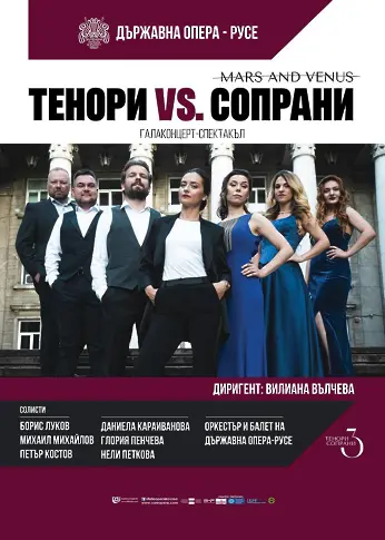 Държавна опера - Русе показва Галаконцерт-спектакъла " МАРС И ВЕНЕРА " - Тенори VS. Сопрани. Трима смели и чаровни тенори ще се изправят против три темпераментни и дръзки сопрана в необикновен Галаконцерт-спектакъл.Даниела Караиванова, Глория Пенчева и Нели Петкова, привърженички на Венера, ще се съревновават с Борис Луков, Михаил Михайлов и Петър Костов, подвластни на Марс.