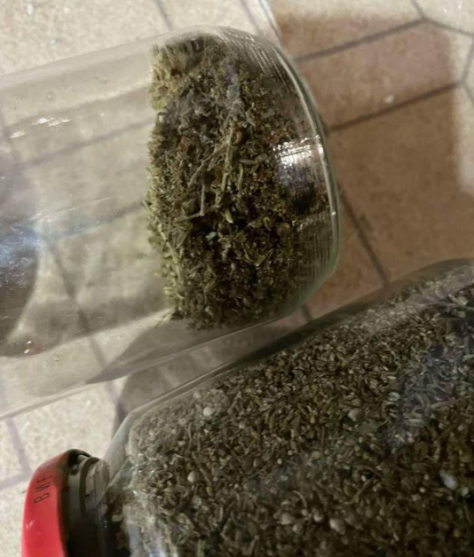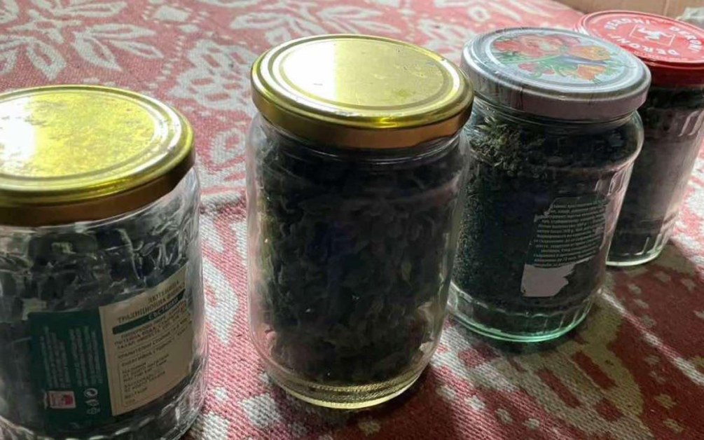 При претърсването са открити сухи зелени тревисти субстанции, съхранявани в стъклени буркани и найлонова торба, както и кафяво-черна растителна маса, опакована в станиол.