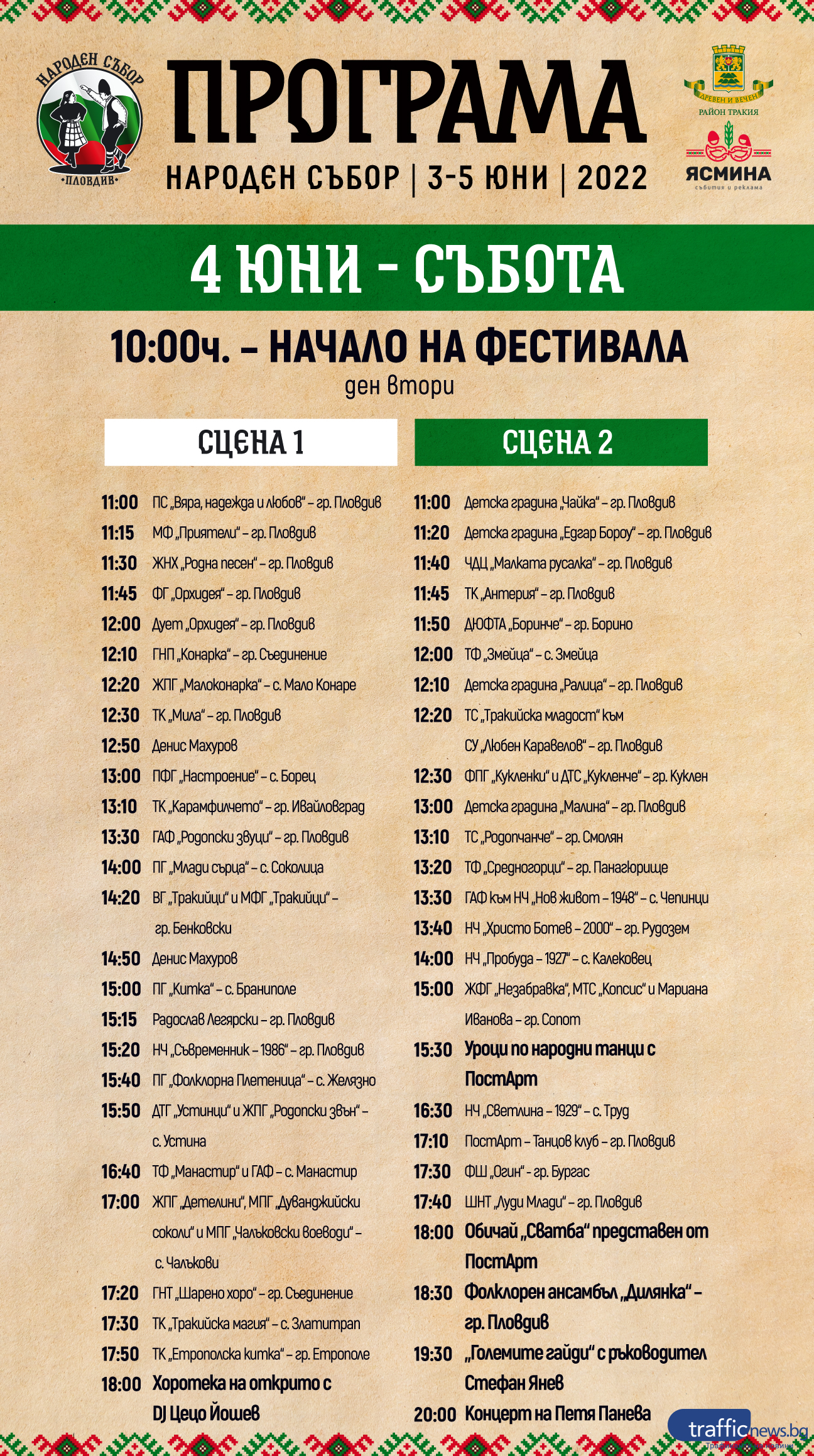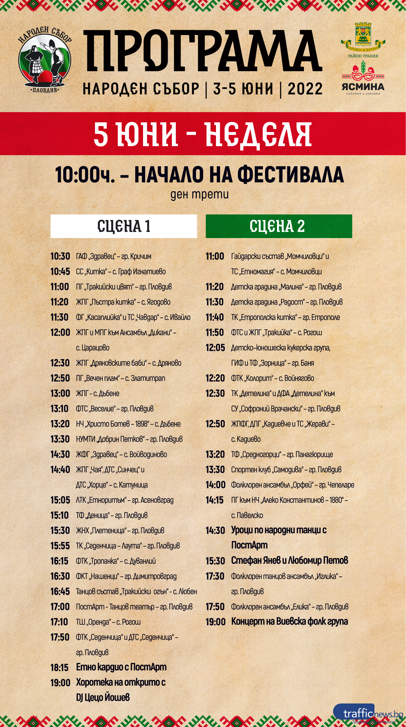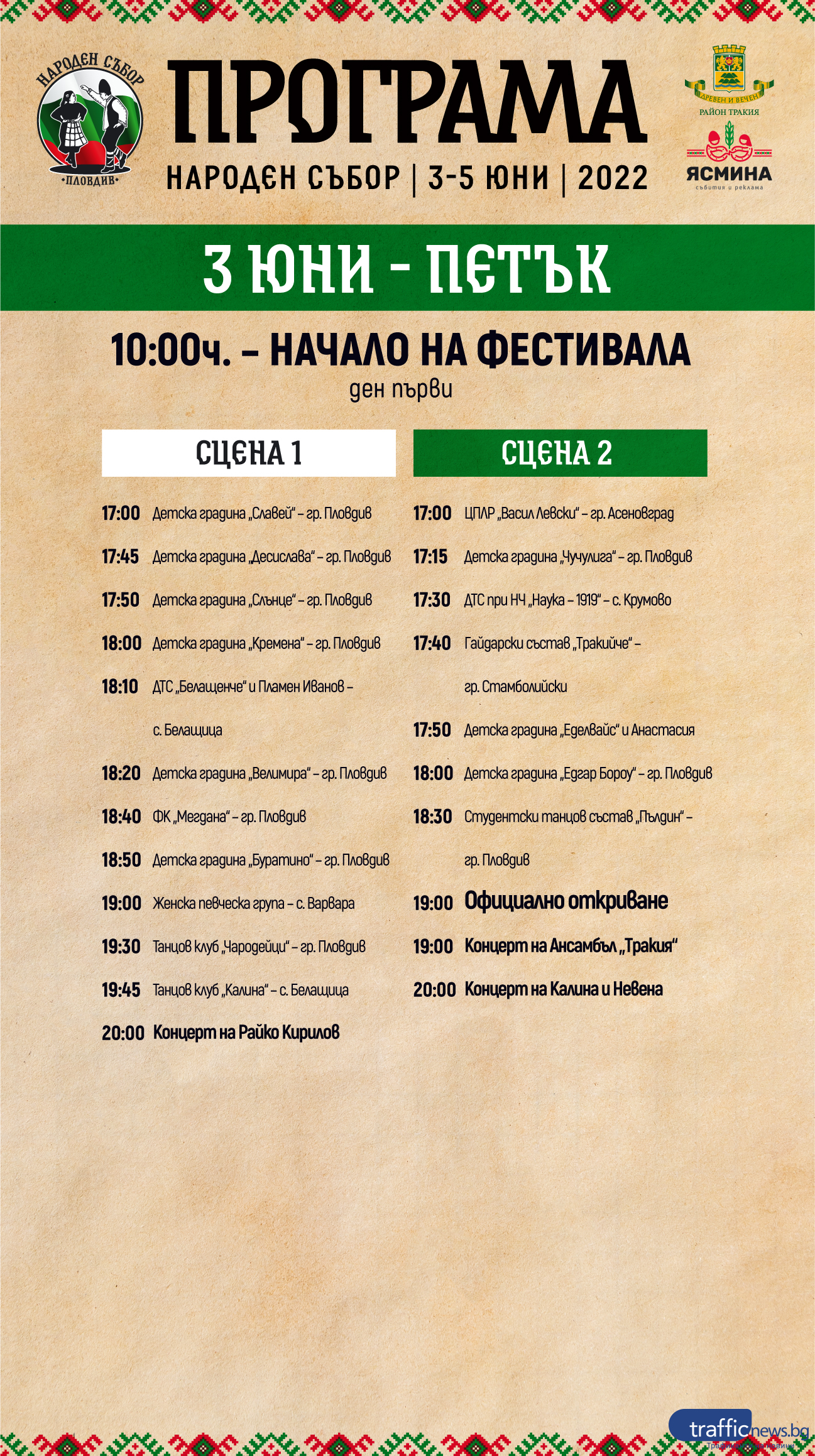 Програмата ще бъде украсена от концертите на „ Гласът на България “ - Петя Панева, Виевска фолк група, Калина и Невена, Райко Кирилов, отбор „ Дилянка “, „ Големите гайди “, гайдарски състав „ Орфей “, а особено за откриването ще видите отбор „ Тракия “!