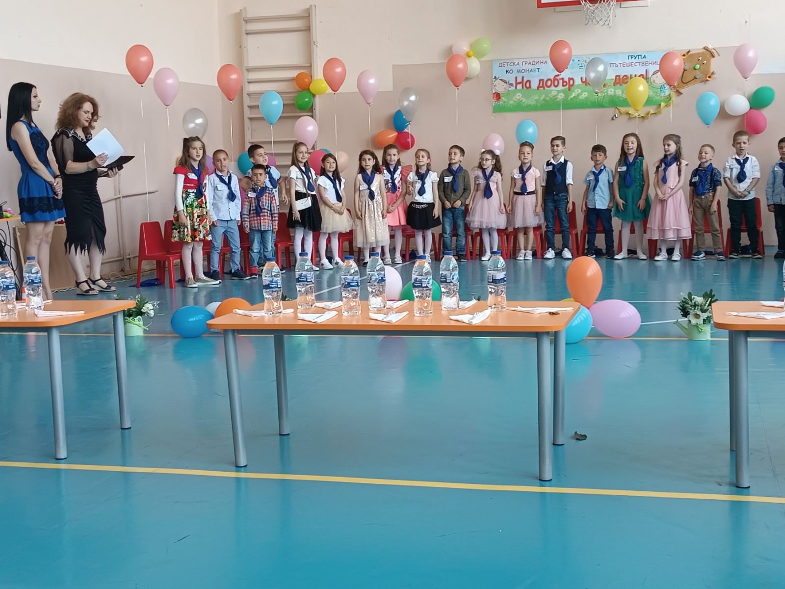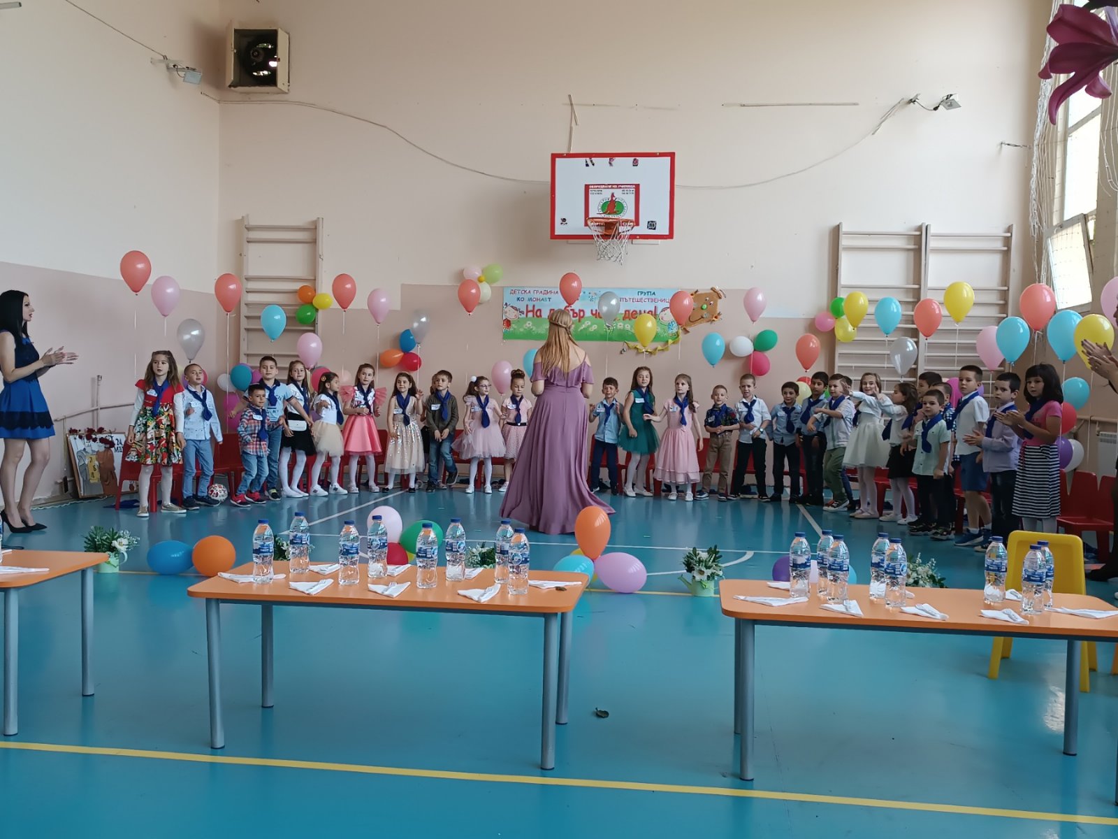 С питка в ръце, учителите Анна Генчева и Марина Маринова предадоха щафетата на сътрудниците си от учебните заведения, които ще поемат децата в първи клас. Децата демонстрираха доста познания - отгатваха гатанки за геометрични фигури, споделяха поговорки, играха занимателни игри, пееха песни и най-много се забавляваха! Родителите от своя страна сервираха своите благодарности, цветя и дарове към учителите на групата и асистент възпитателя - Гергана Манева. Изказваме своите благодарности към шефа на СУ " Никола Вапцаров " Стратиев, който даде с удоволствие физкултурния салон.