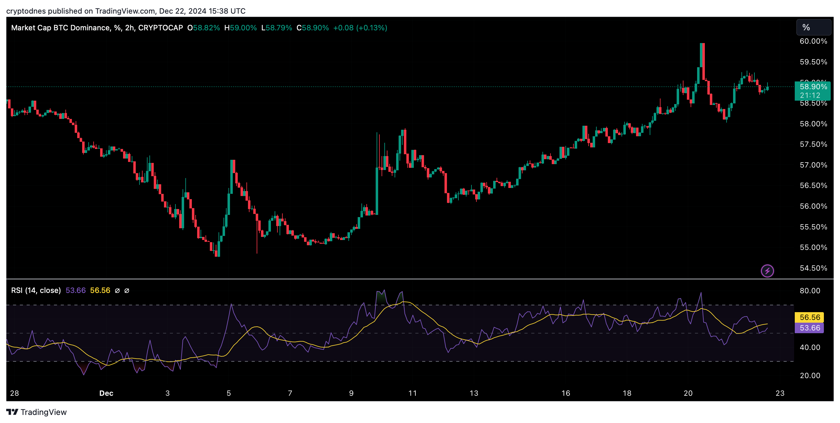 Неотдавна превъзходството на BTC набъбна до 62%, намалявайки представянето на алткойните. И въпреки всичко, все още на писане на публикацията, превъзходството е намаляла до 58.9%. Тази смяна допуска, че алткойните си възстановяват част от пазарния дял, което може да докара до по-силно показване, в случай че наклонността се резервира.