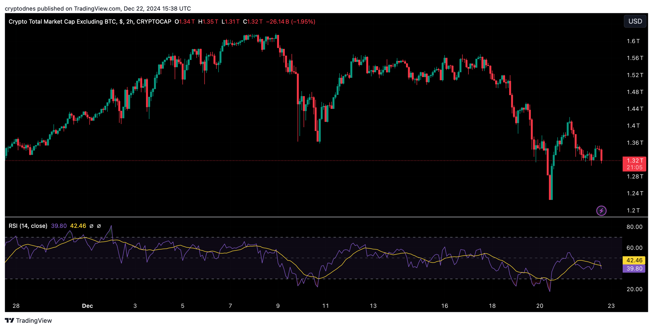 Пазарната капитализация на TOTAL2, която наблюдава представянето на 125-те най-големи алткойна, неотдавна спадна до $1.35 трилиона, наблягайки актуалното едва показване на различните монети. Подобен спад нормално алармира за закъснение на алткойн сезона, защото BTC продължава да господства на пазара.