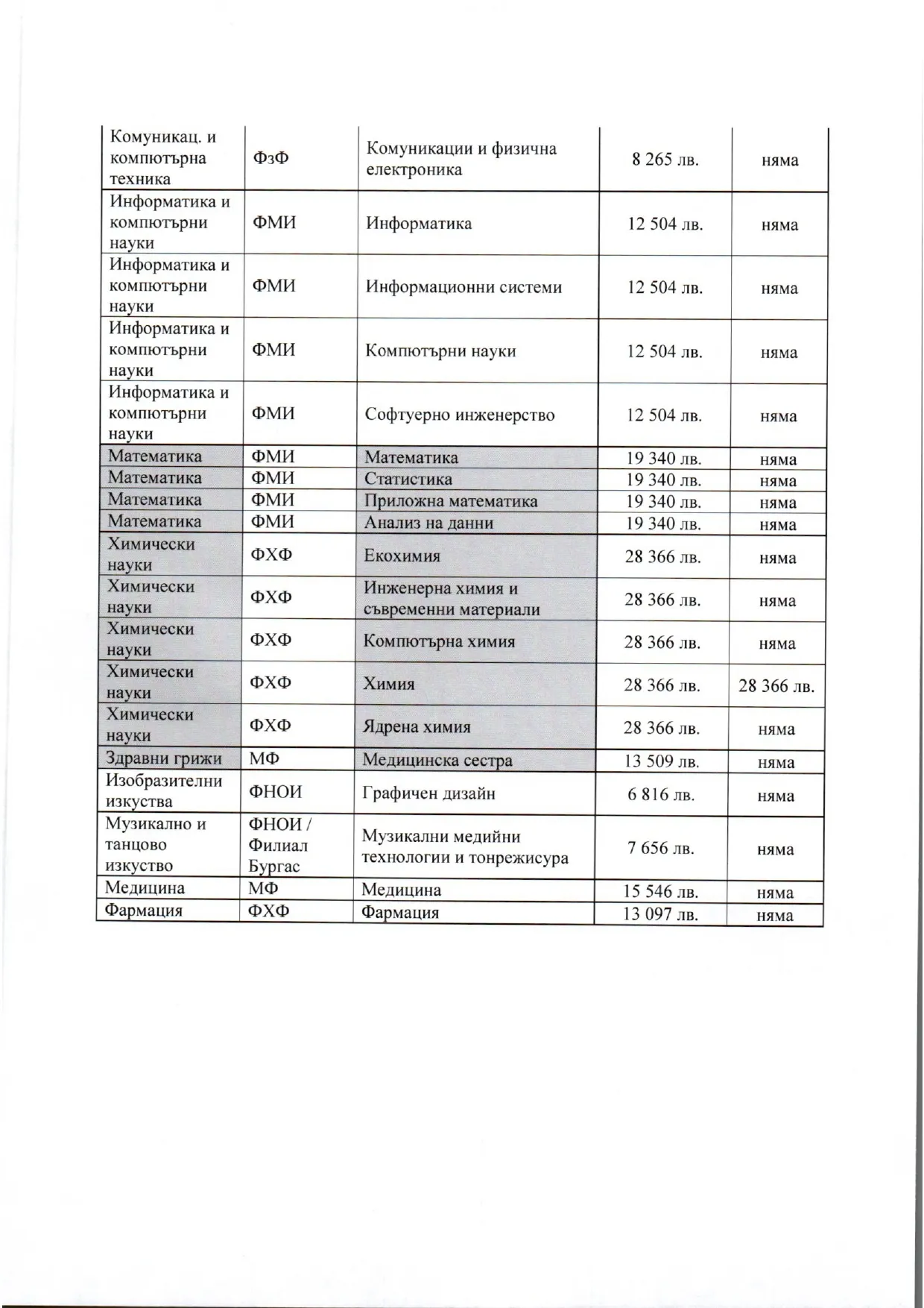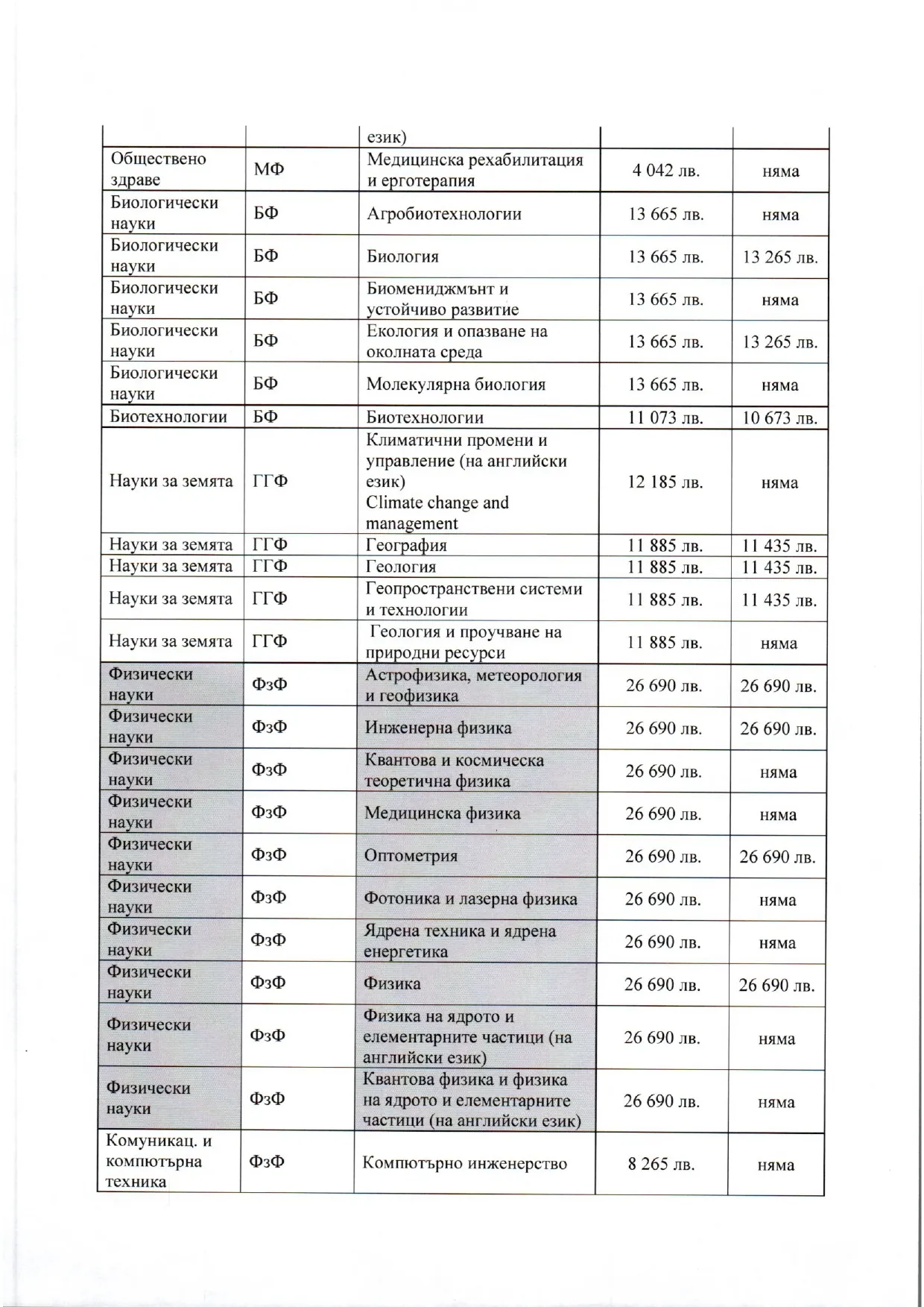 Такси, сходни като тези за компетентност Екохимия, с изключение на във Факултета по химия и фармация, има и във Физическия факултет, където таксите за всички специалности са по 26 690 лв. на година.