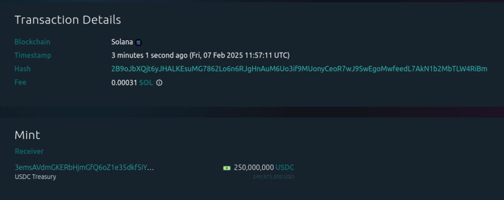 На 7 февруари компанията Circle, която стои зад една от водещите постоянни монети, емитира USDC на стойност $250 милиона в блокчейна на Solana.
