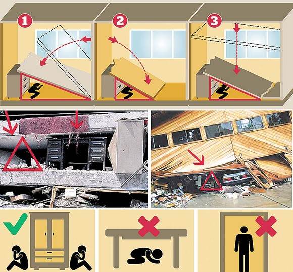 Ако се намираме в жилище и сме на високи етаж за подобен тип триъгълник може да ни послужи обърната секция, висока мебел, облегната на стена и тн. Може би учудващо ще наподобява за всички, че елементарни мебели, като кухненски долап, печка, пералня, ледник, имат релативно висока товароносимост. Заставайки до тях и под тяхното равнище ние усилваме доста шанса си да не бъдем премазани от падащи предмети, в това число и разграничителна плоча сред етажите.