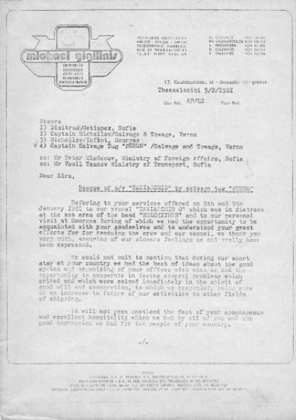 Благодарствено писмо от корабособственика на транспортен съд „ Таксиархис “ до министъра на външните работи, министъра на превоза и други податели.