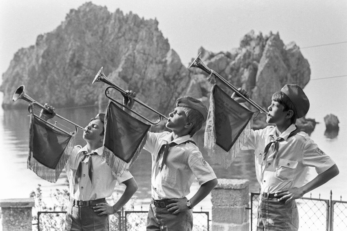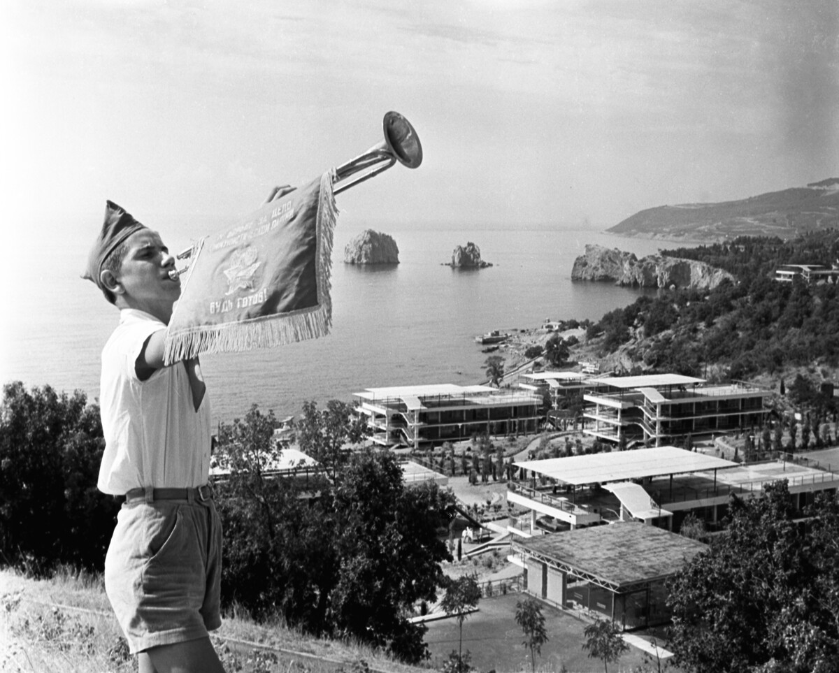 Владимир Родионов/Sputnik Пионерската тръба става различен знак на Артек. Звукът на тръбата бележи времето за пробуждане и лягане.