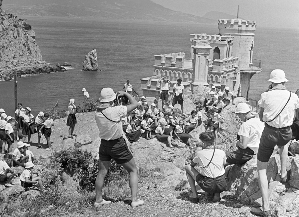 Понякога пионерите вървят и на екскурзии из Крим – в Ялта, Севастопол и други забележителности. На фотографията по-долу виждате деца пред емблематичния палат „Лястовиче гнездо“.