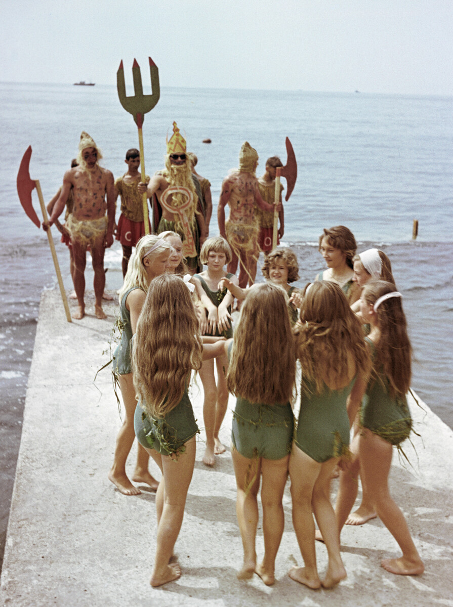 Рясин/Sputnik Един от обичаните празници на децата е Денят на Нептун, чиито корени са в морските тържества към прекосяването на екватора, известни като гала по секване на линията. Обикновено в Артек има карнавал с танци и песни. Лагерниците принудително се вкарват във водата или се плискат и, несъмнено, се къпят в морето.