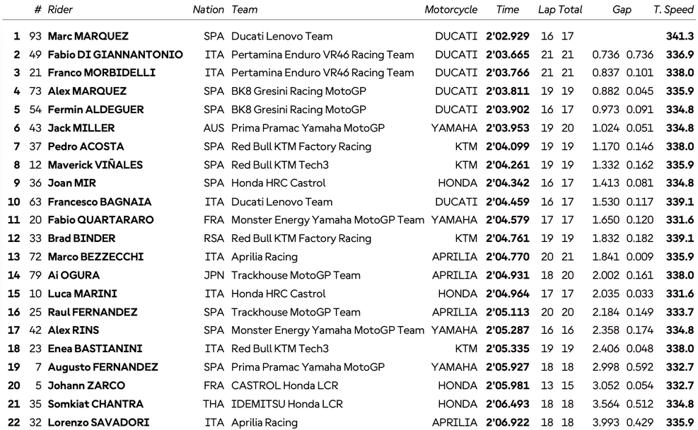 Тогава Маркес стигна до 2:02.929, като той беше единственият водач, който слезе под 2:03 за обиколка на „ Пистата на Америките “. С този си тур водачът на Дукати си обезпечи задатък от цели 0.736 секунди пред Фабио Ди Джанантонио, чийто съотборник във VR46 Дукати Франко Морбидели добави тройката с пасив от 0.837 по отношение на Маркес.
