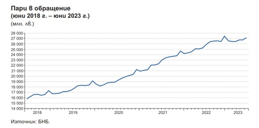 Парите в обращение у нас възлизат на 27.197 милиарда лв. към края на първото полугодие на актуалната 2023 година, сочат данните на БНБ. Общата стойност на банкнотите и монетите в родната стопанска система, е повишена с 9.83 милиарда лв. или 57% по отношение на средата на предпандемичната 2019 година. За съпоставяне, към края на юни 2019 година парите в обращение са възлизали на 17.3 милиарда лв..