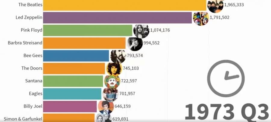 Красива графика ни демонстрира по какъв начин са се изменяли челните позиции, като всяка година е разграничена на четири интервала. Групи като The Beatles, Led Zeppelin и Pink Floyd през 70-те, реализатори като Michael Jackson, Madonna и Elton John през 80-те, та до модерни имена като Rihanna, Adel и Drake.