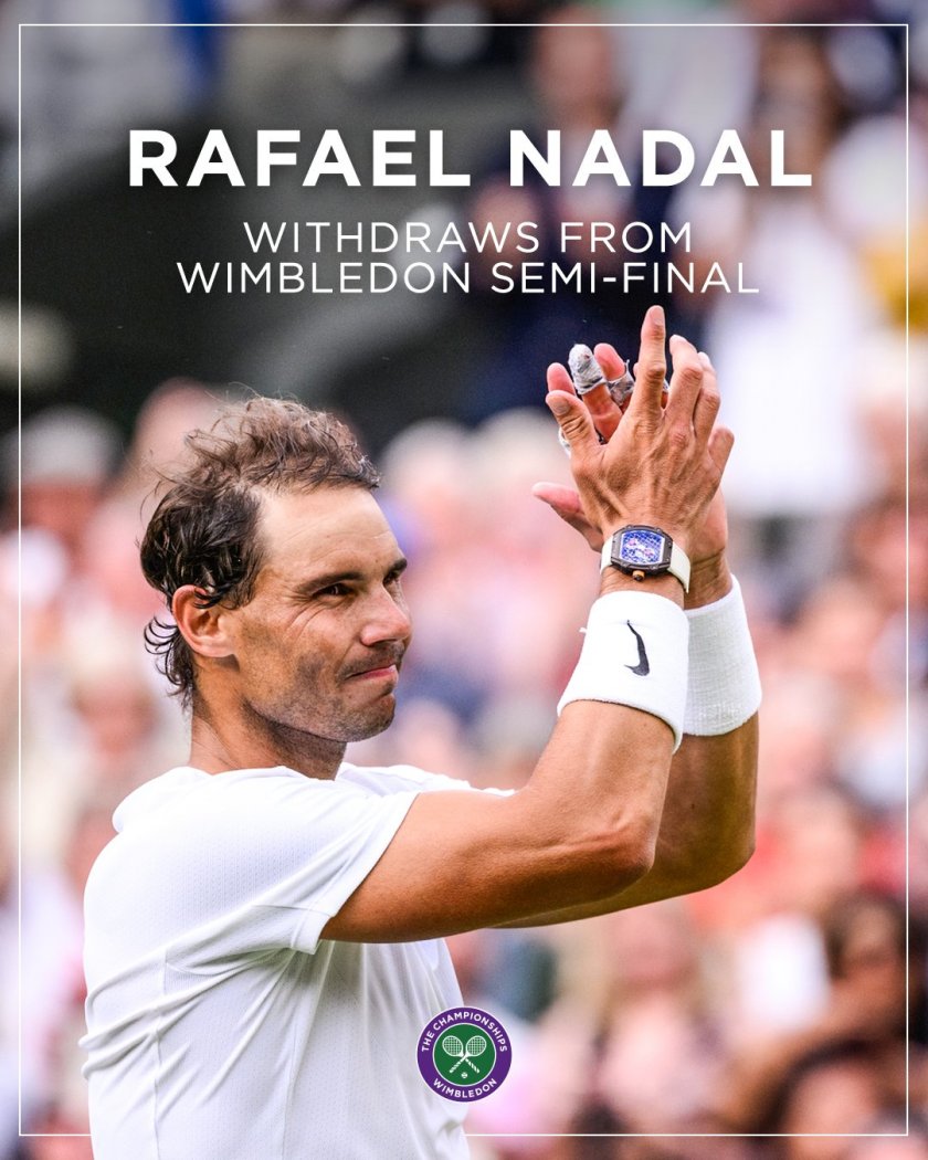 На ексклузивен брифинг 22-кратният притежател на трофеи от Големия шлем – Рафаел Надал, разгласи публично, че поставя завършек на присъединяване си на " Уимбълдън ". Причина за решението му е травма в региона на корема, която се случи по време на срещата му с Тейлър Фритц в четвъртфиналната фаза от конкуренцията.