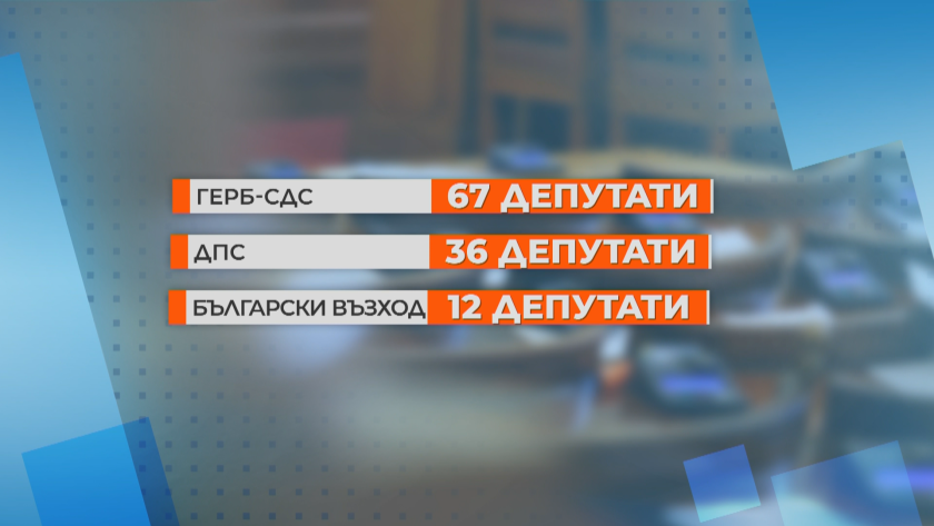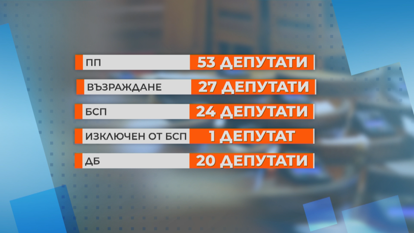 Няма да ги поддържат от " Продължаваме промяната ", които имат 53 депутати. " Възраждане " имат 27 депутати - те всички ще гласоподават срещу.БСП останаха с 24-ма народни представители, след изключването на Явор Божанков. Всички те няма да поддържат кабинет с мандат на ГЕРБ20-те депутати на " Демократична България " също ще гласоподават срещу.